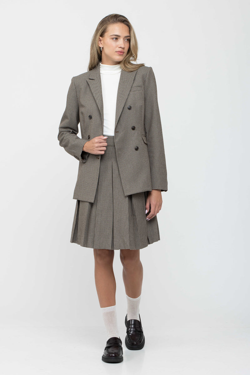 חצאית קפלים צנועה באורך ברך. מבד נעים עם פרינט בגוונים חומים