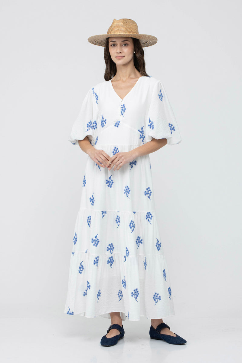 שמלת מקסי בצבע לבן עם רקמת פרחים כחולים.