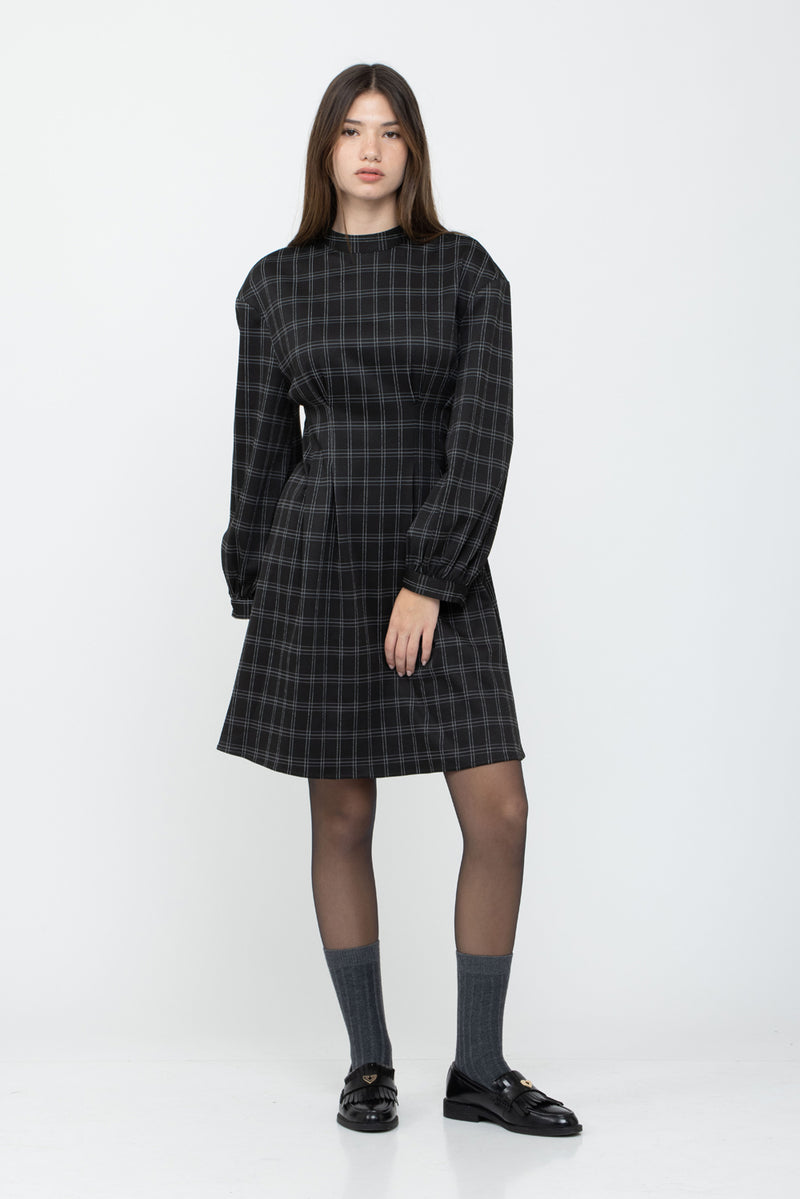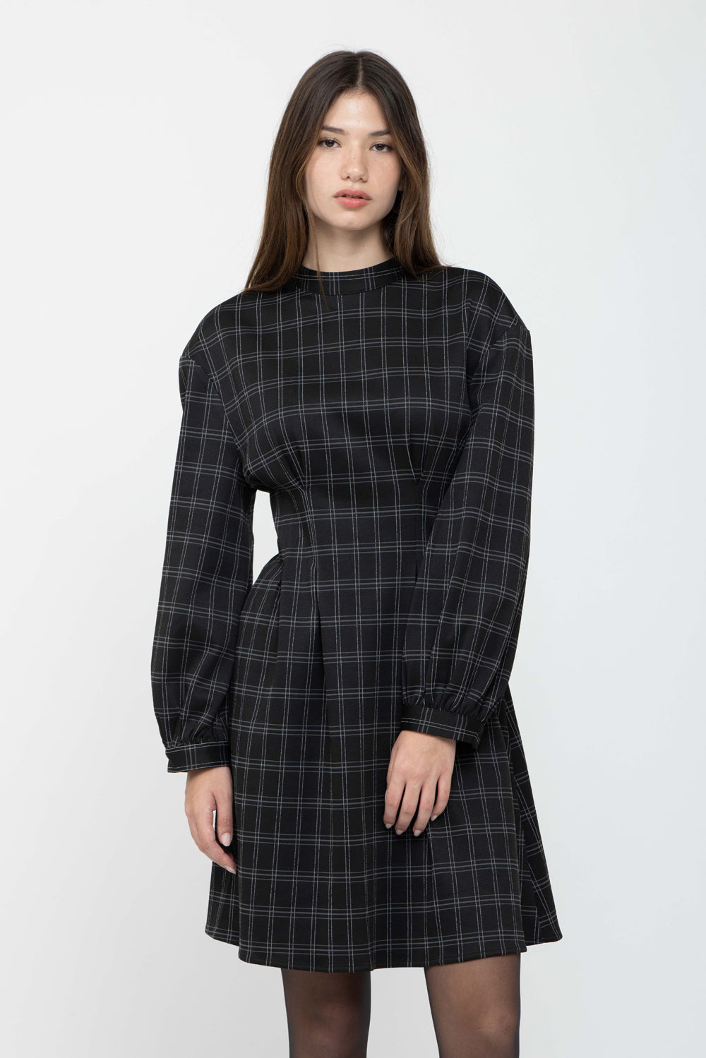 שמלה שחורה עם הדפס משבצות לבנות באורך הברך. צווארון עגול שרוולים מיוחדים בסיומת חפת. כיווצים בחלק הקדמי. דיטיילס של קשירה בגב עם אפשרות התאמה ורוכסן נסתר. בד נעים וחורפי.