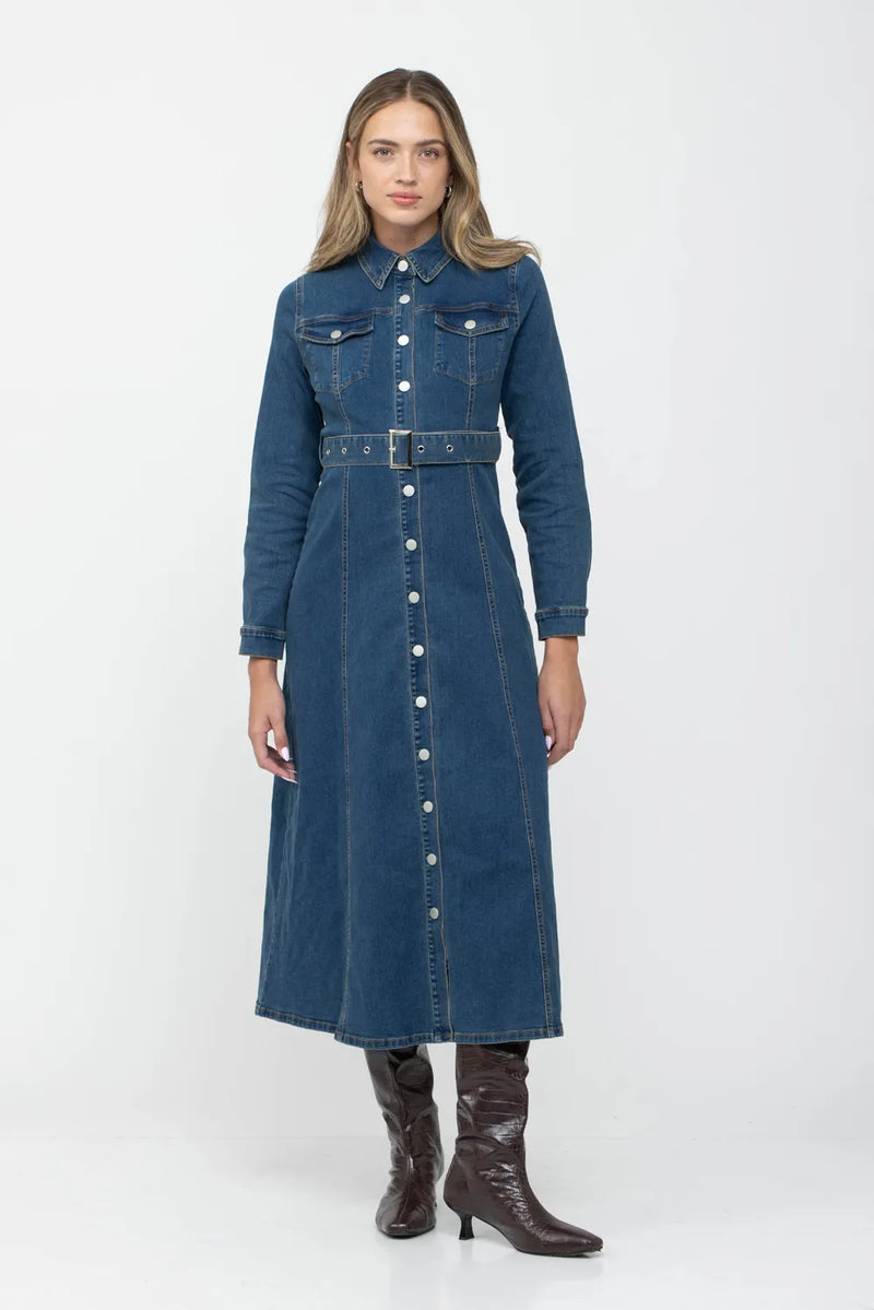 שמלה צנועה מבד ג׳ינס בצבע כחול באורך מקסי.