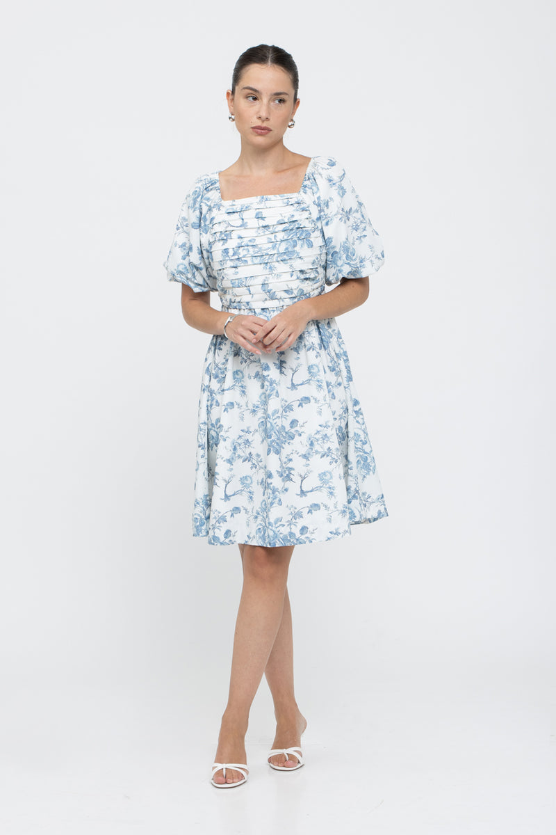 שמלה צנועה עם פרינט פרחים כחולים על רקע לבן מבד קליל ונושם.