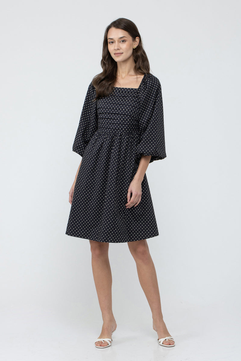 שמלה באורך הברך בצבע שחור עם פרינט נקודות בצבע קרם מבד קליל ונושם