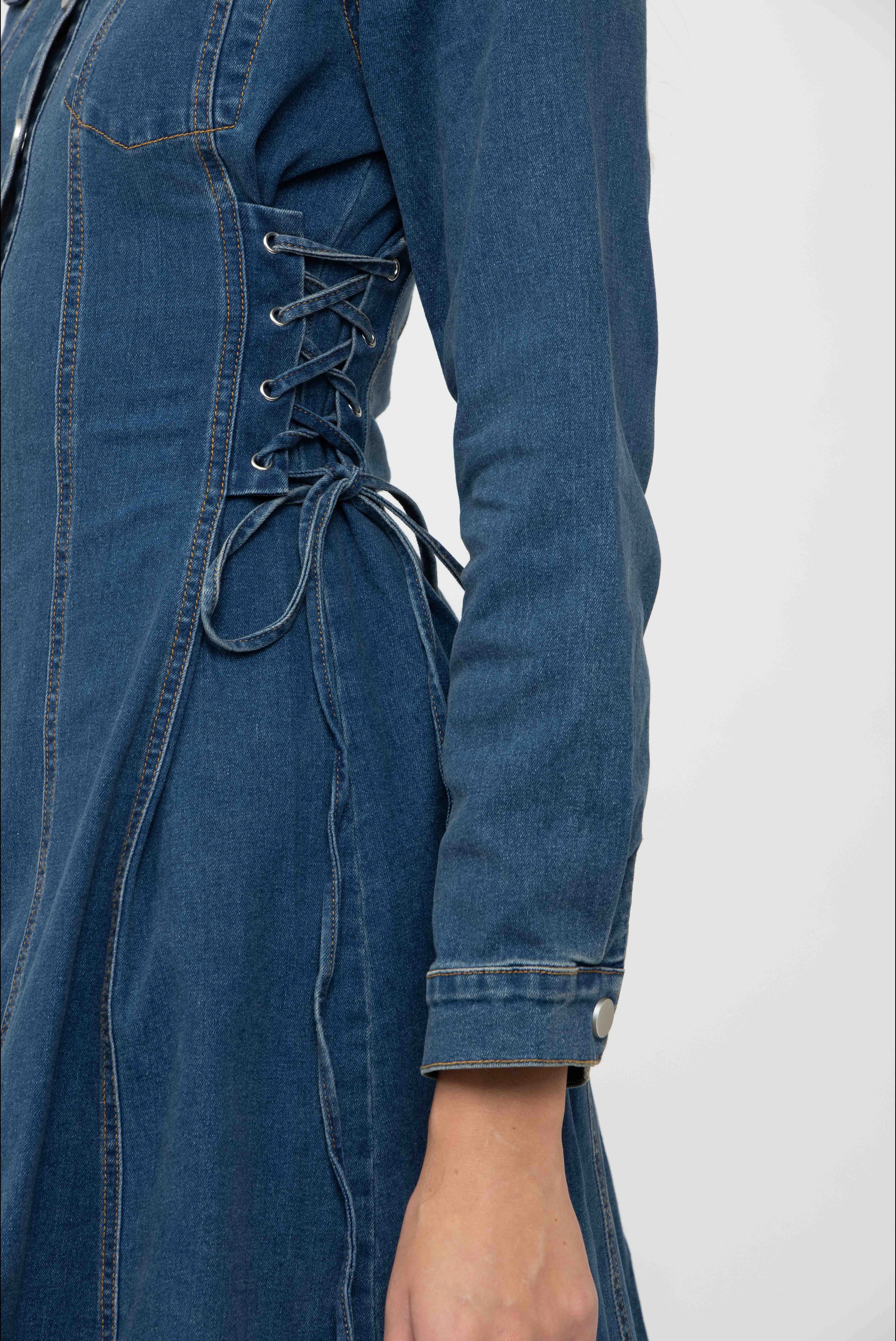 שמלה צנועה מבד ג׳ינס בצבע כחול באורך ברך.