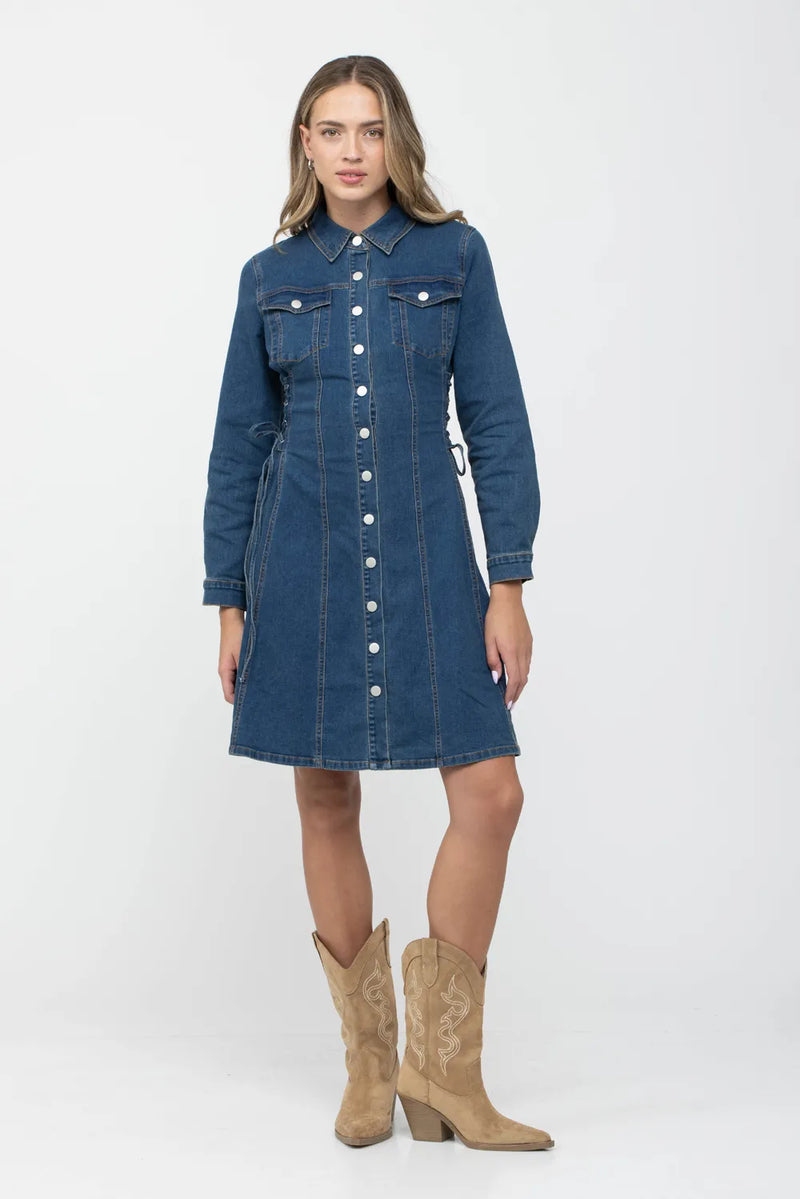 צווארון עם רקמת הלוגו וכפתורי תיקתק לאורך השמלה. שרוולים ארוכים בסיומת כפתור.