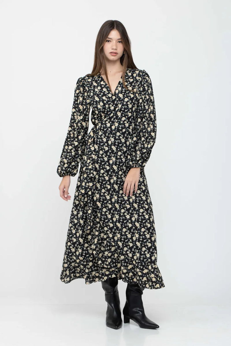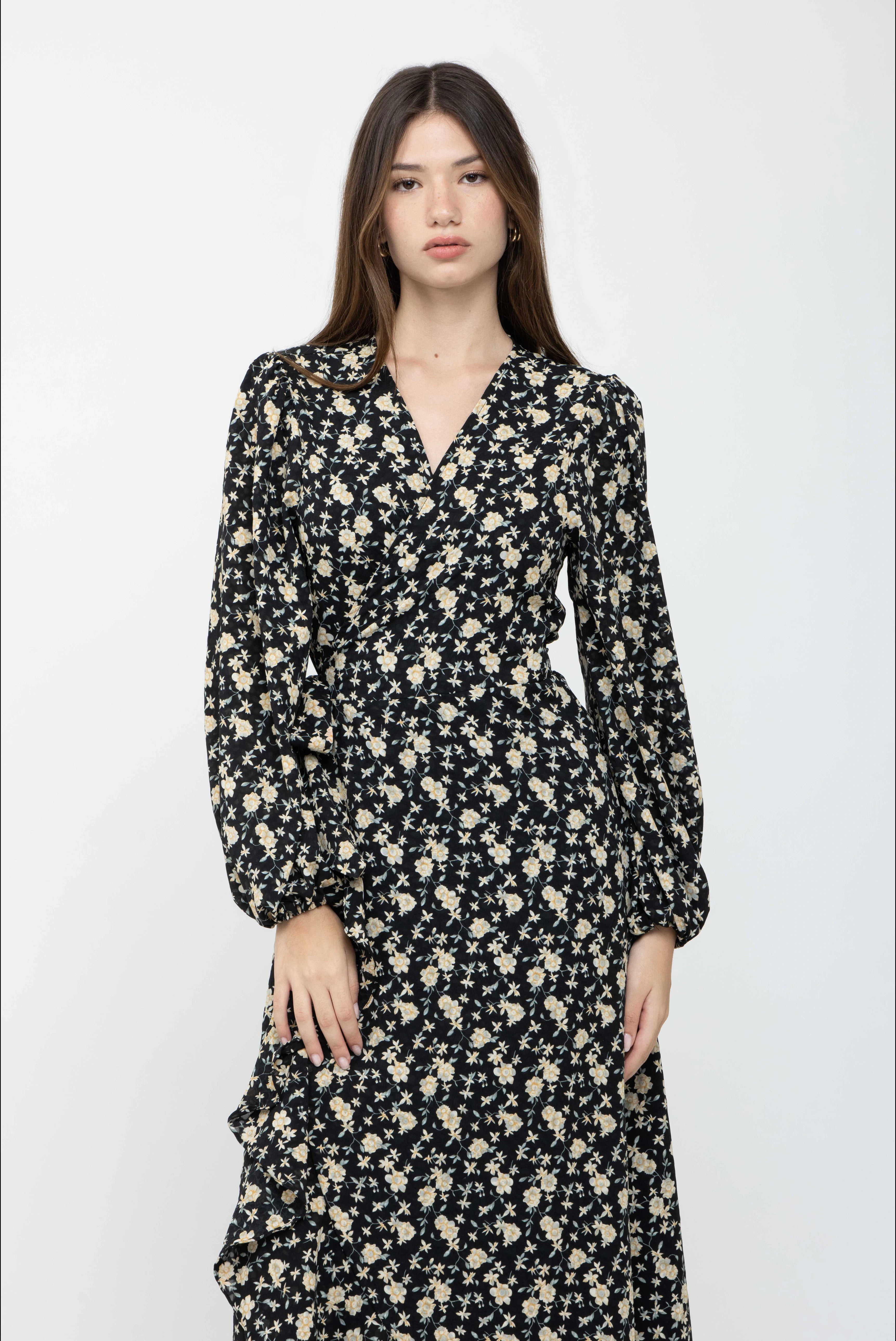 שמלה צנועה בגזרת מעטפת עם הדפס פרחים בצבע קרם על רקע שחור באורך מקסי.