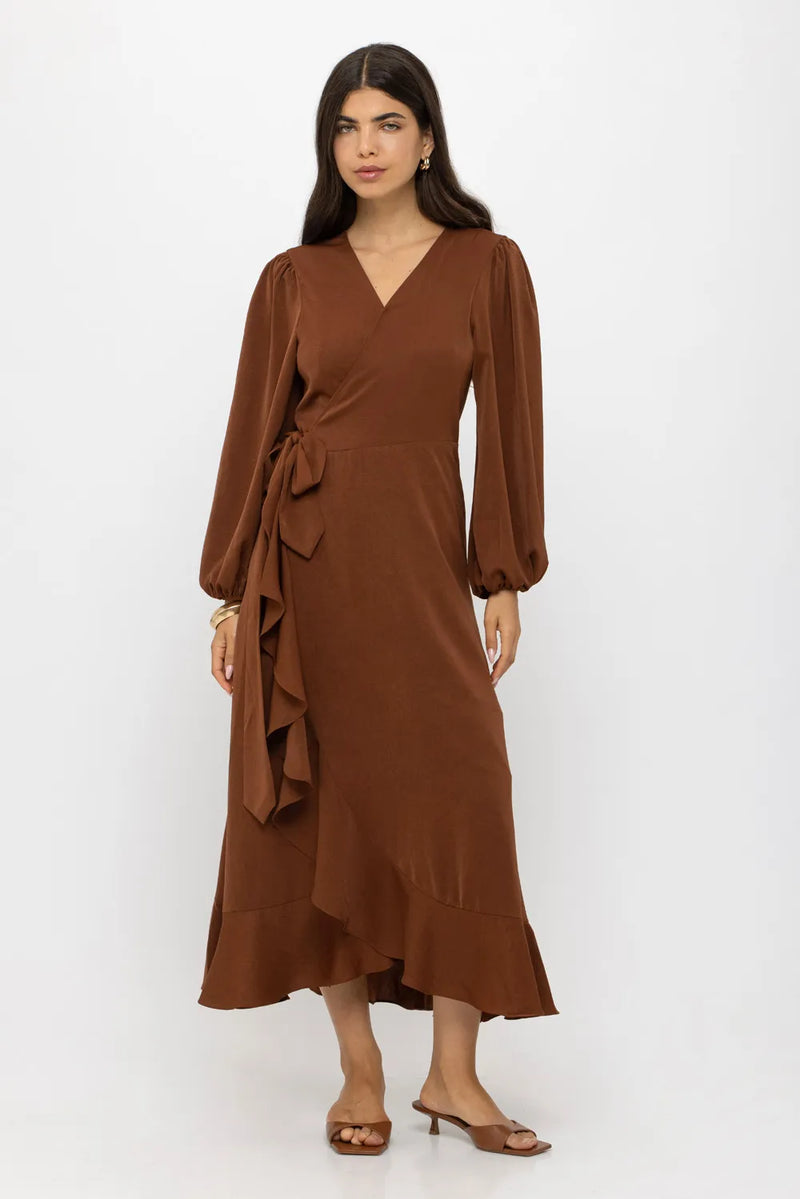 שמלת מעטפת באורך מקסי בצבע חמרה מבד רך ונעים עם בטנה תואמת.