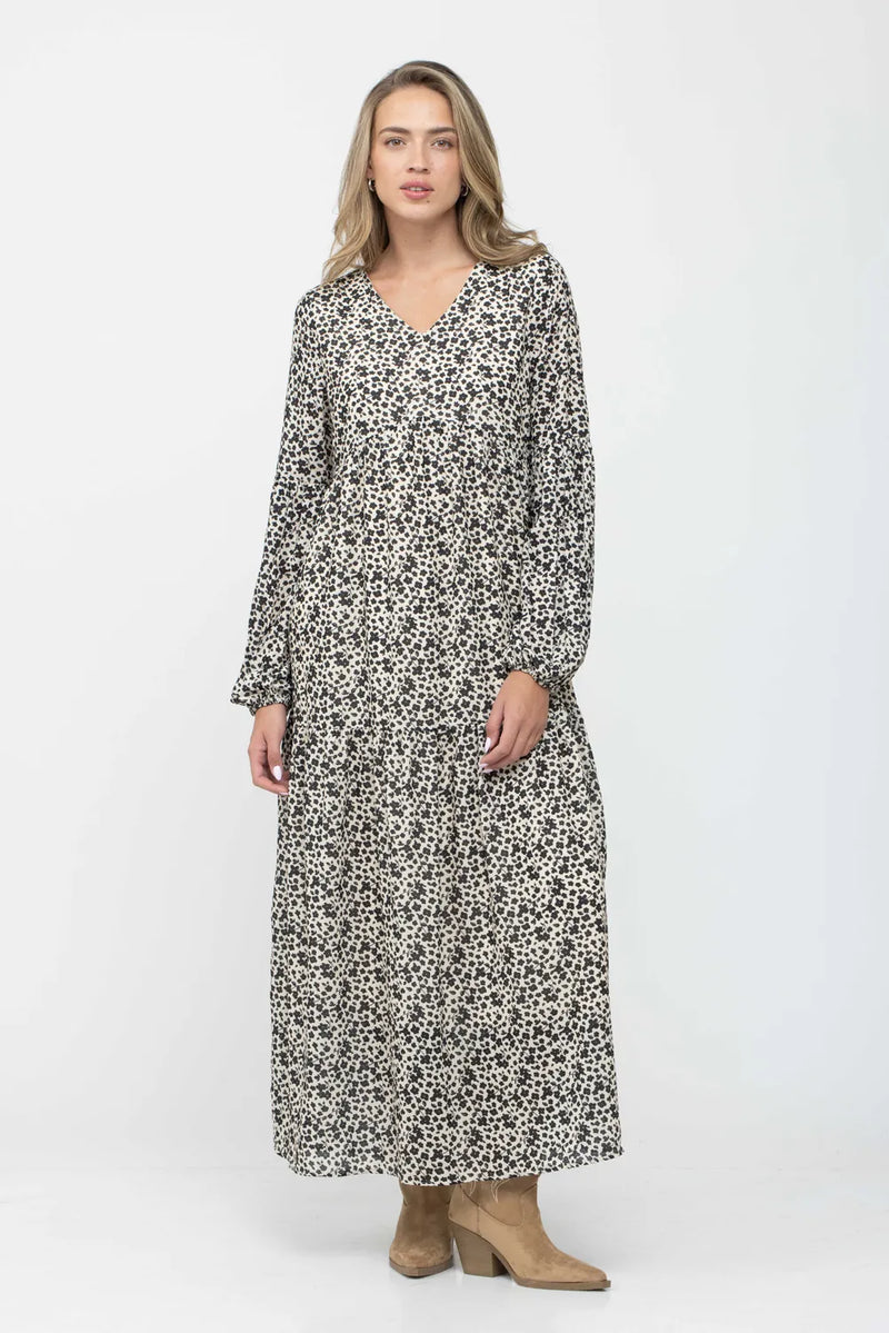 שמלה צנועה בגזרת מקסי עם הדפס פרחים שחורים על רקע קרם.