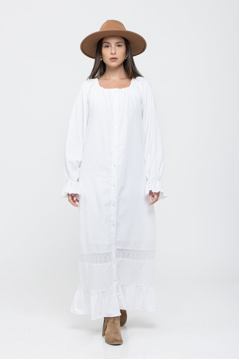 שמלת בוהו צנועה בצבע לבן