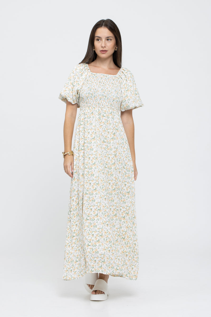 שמלה צנועה עם כיווצים בחלק העליון באורך מקסי עם שני שסעים מעל הברך.